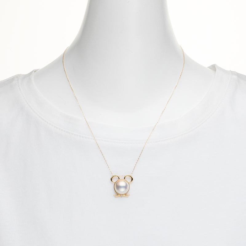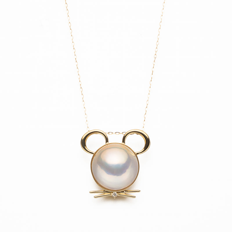 K18イエローゴールドに、12mmのマベパールをあしらったネズミモチーフのペンダント。ふっくらとしたシルエットが愛らしく、お鼻にはきらりと輝くダイヤモンドを添えました。ユニークながら上品な印象で、大人の遊び心を感じさせるデザインです。チェーンには長さ調節機能が付いているため、装いに合わせて自在に調整が可能。可愛らしさと上質さを兼ね備えた、心くすぐる一品です。