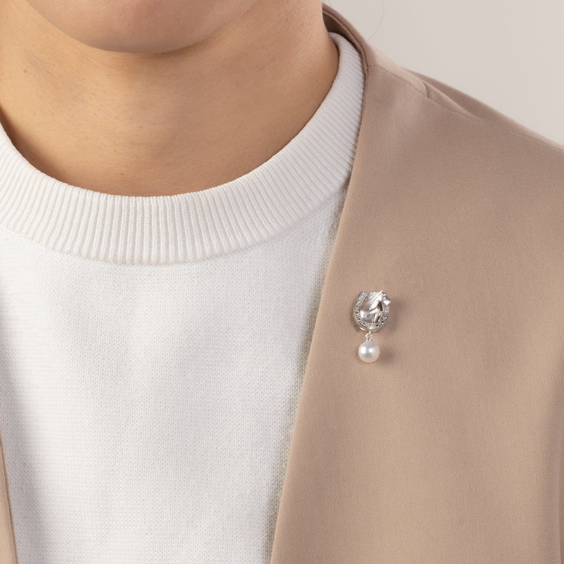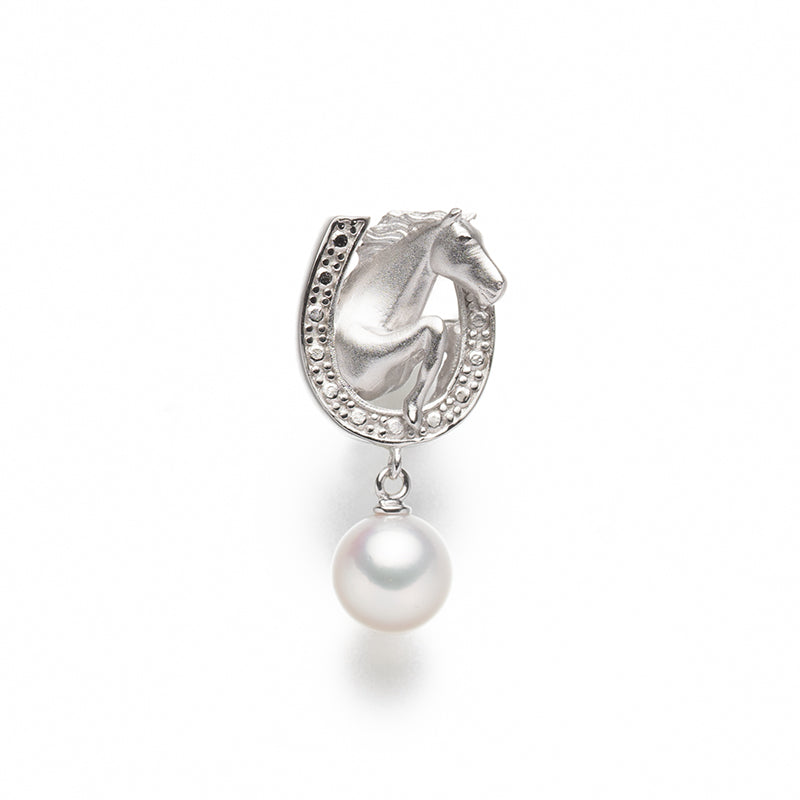シルバーで立体的に表現された馬のモチーフに、幸運の象徴とされる蹄鉄を組み合わせた、縁起の良いデザインのピンブローチです。下部には約7mmのアコヤパールが揺れる仕様になっており、動くたびに上品な光沢を放ちながら、華やかなアクセントを添えます。力強さと優雅さを併せ持つ馬のフォルムと、柔らかく輝くパールの調和が美しく、ジャケットやバッグにワンポイントで取り入れるだけで存在感のある装いに。乗馬好きの方への贈り物にもおすすめの一品です。