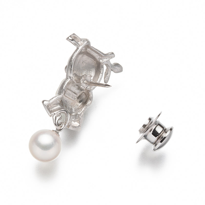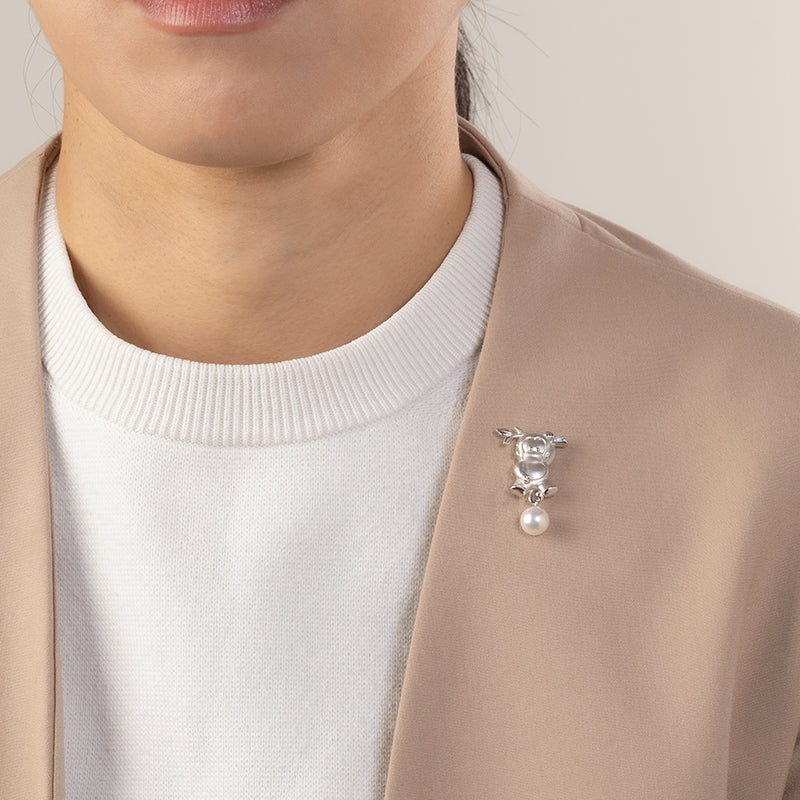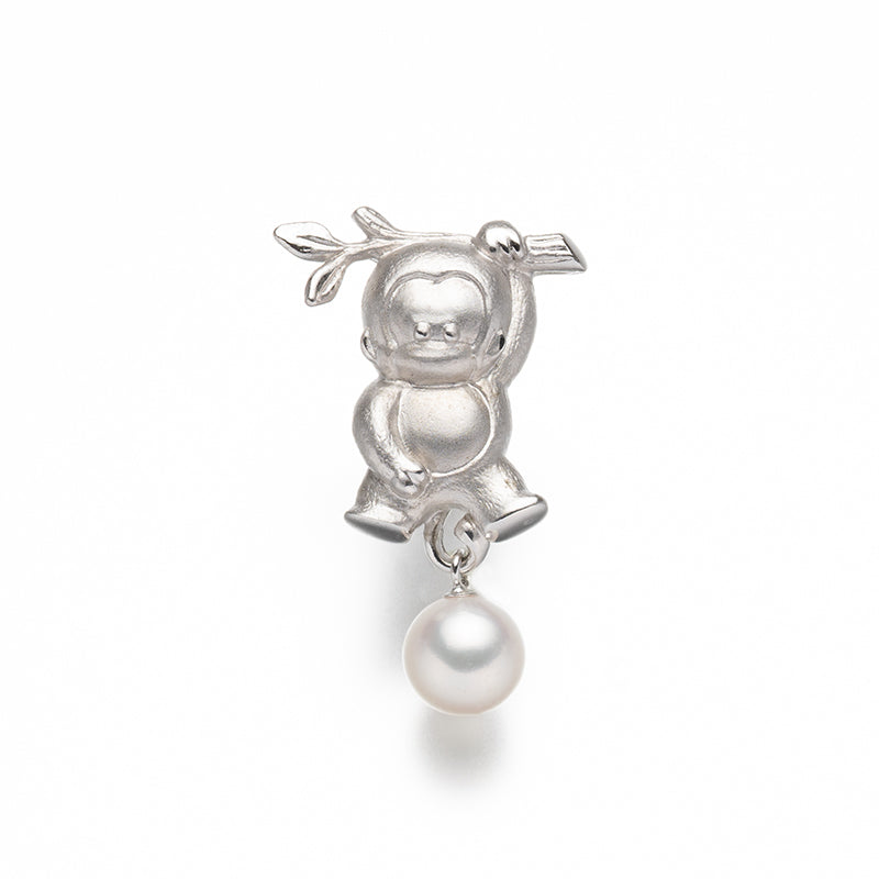 シルバーで立体的に仕上げた可愛らしいモンキーモチーフに、約7.5mmのアコヤパールをあしらったピンブローチです。枝につかまっているようなユニークなポーズが愛嬌たっぷりで、下に揺れるアコヤパールが動きに合わせてやさしく輝きます。遊び心と上品さを兼ね備えたデザインは、ジャケットやバッグ、帽子のワンポイントにぴったり。見ているだけで思わず笑顔になる、贈り物にもおすすめのチャーミングな一品です。