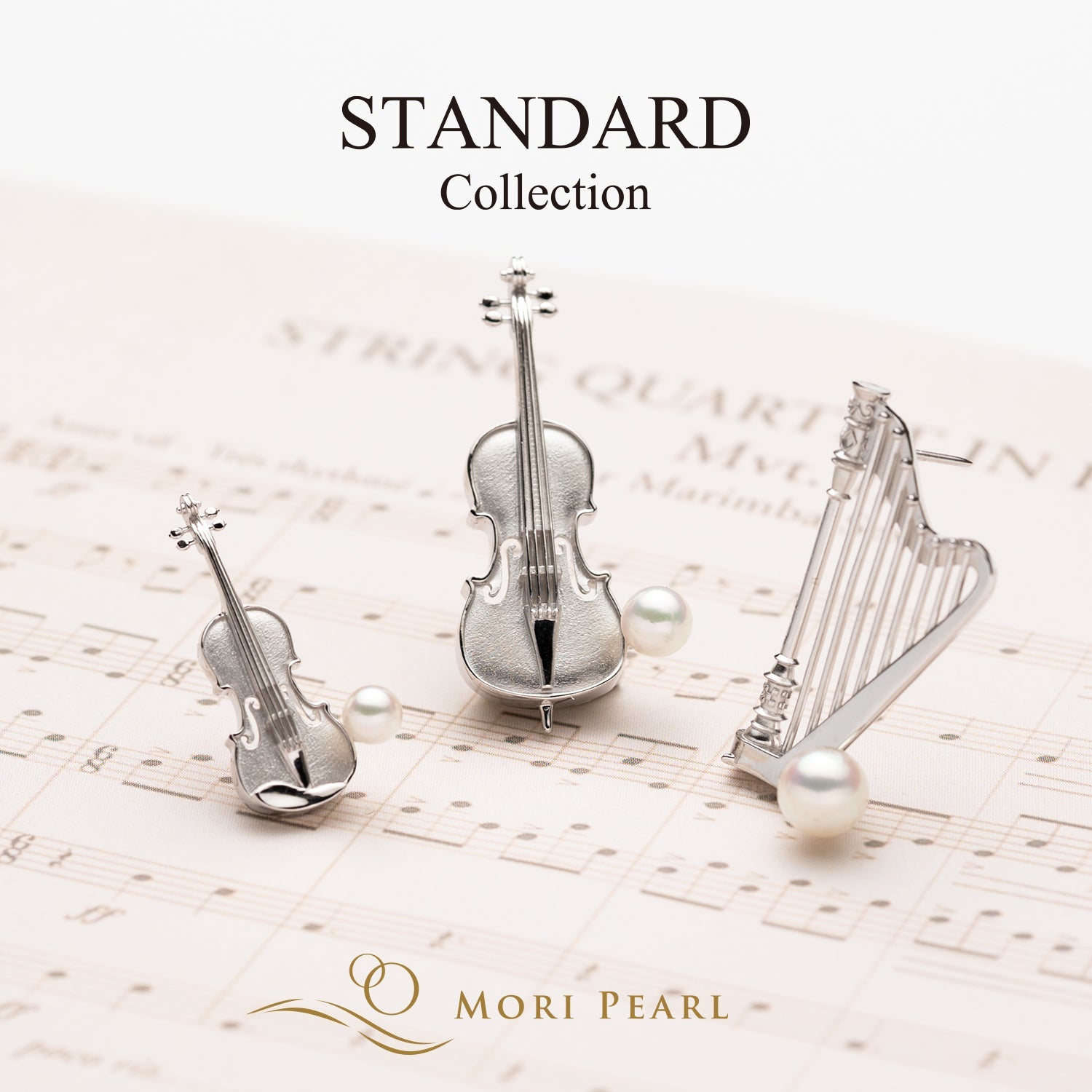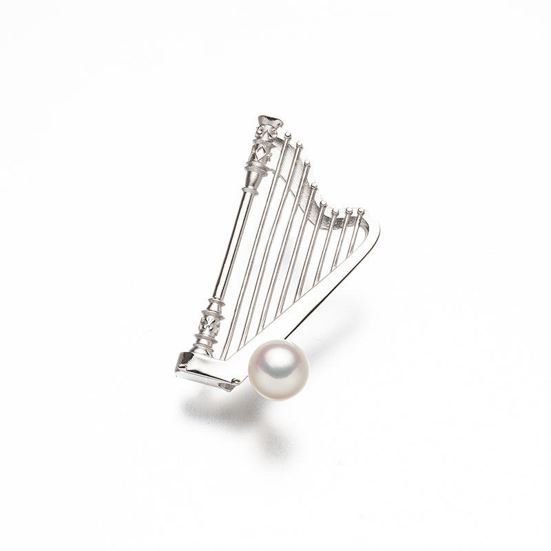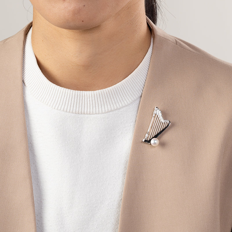 シルバーで繊細に仕立てたハープモチーフに、約7.5mmのアコヤパールを合わせたエレガントなピンブローチです。楽器の美しい曲線や細やかなディテールが際立ち、上品な光沢を放つアコヤパールが静かな高級感を添えます。ジャケットの襟元やワンピース、ストールなどに軽やかに留めるだけで、クラシックな華やぎを演出。音楽好きな方への贈り物にも喜ばれ、日常にも特別なシーンにも活躍する、洗練されたデザインの一品です。