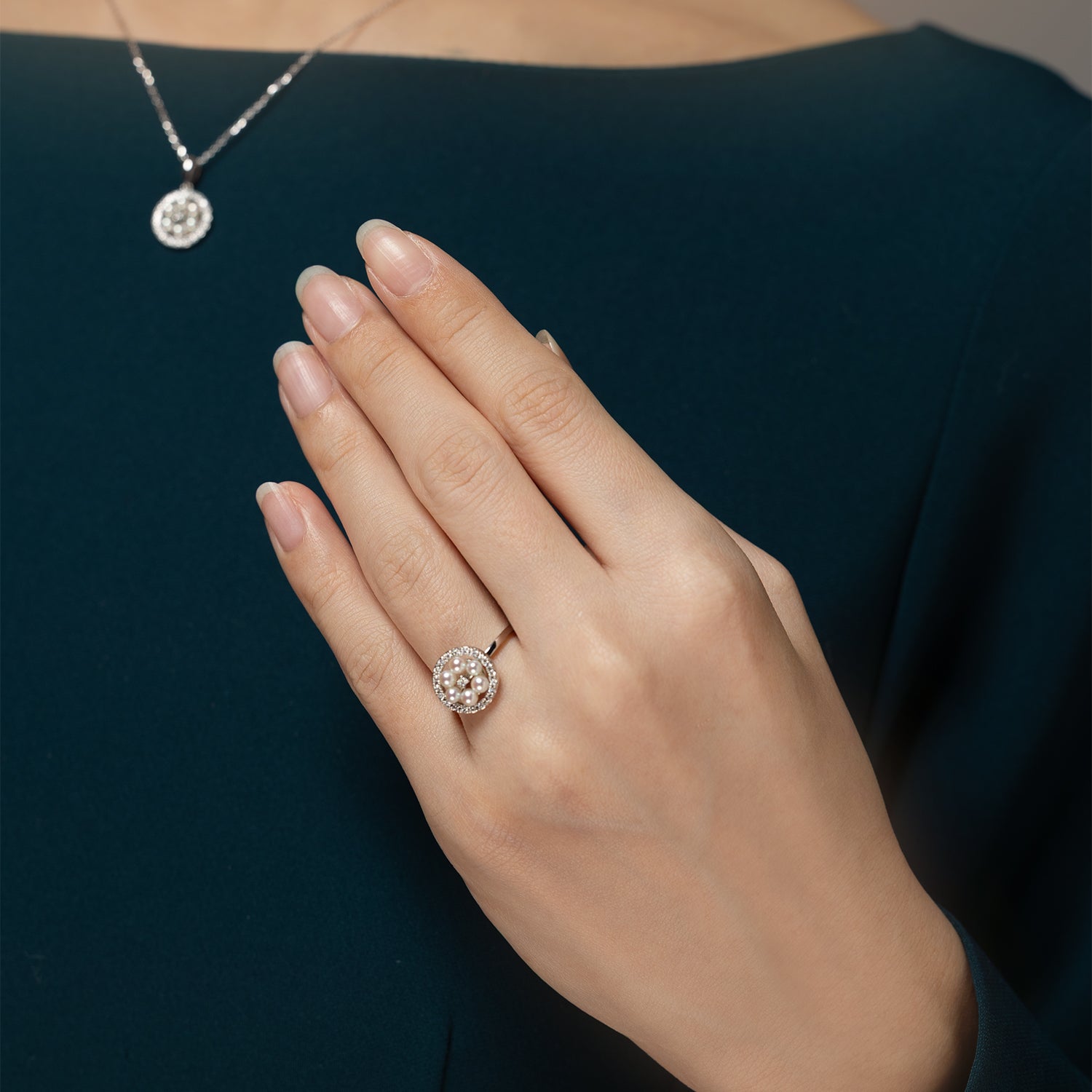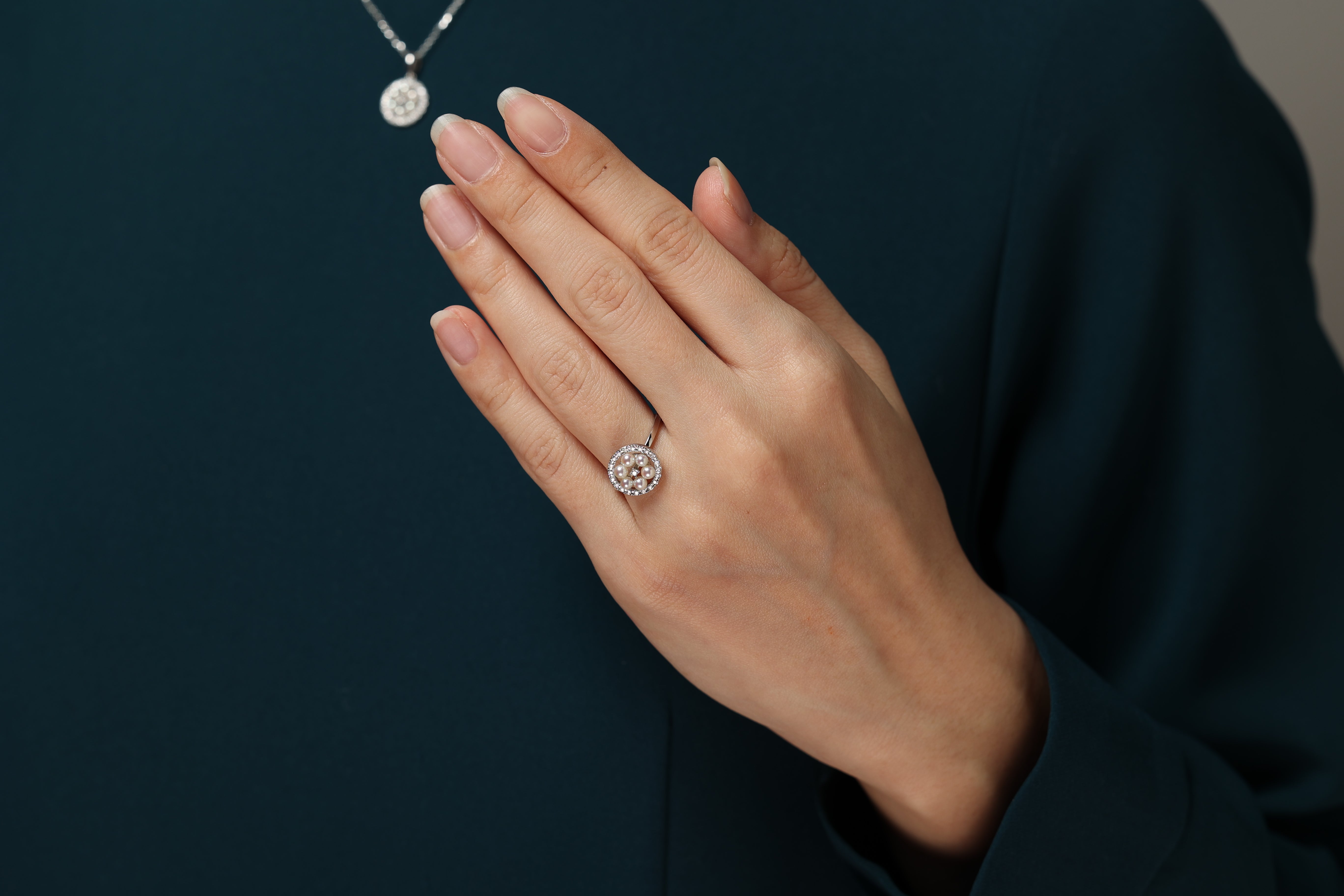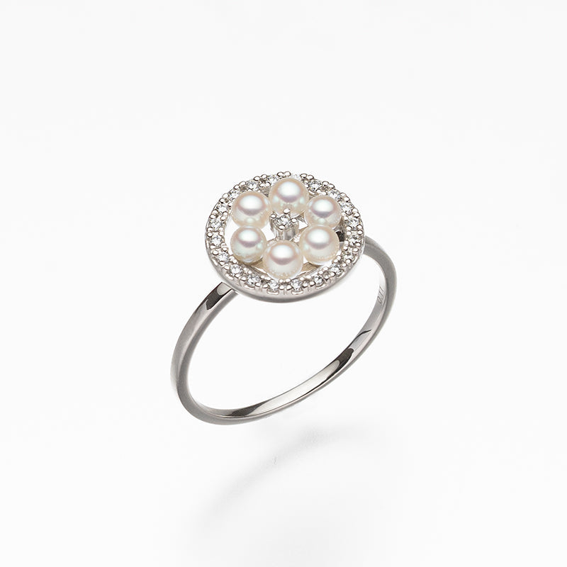 小さな6粒のアコヤベビーパールが花の形に並び、中央のダイヤモンドが穏やかな光を放つリング。