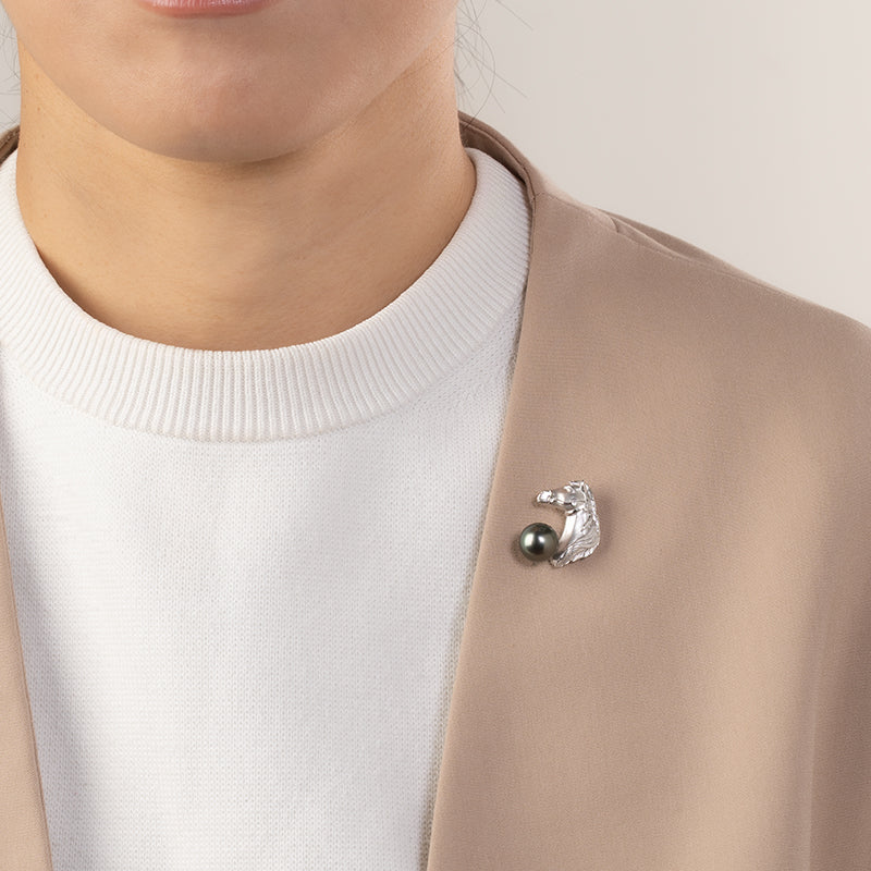 シルバーでリアルに表現された馬のモチーフに、約9.5mmの黒蝶パールを合わせた気品あふれるピンブローチです。たてがみや表情まで細やかに彫り込まれた造形美が際立ち、深い輝きを放つ黒蝶パールが上質なアクセントとして存在感を高めます。エレガントで力強い印象は、ジャケットの襟元やバッグに添えるだけでコーディネートを格上げ。乗馬好きの方や、上品で個性的なアクセサリーを好む大人の方への贈り物にも最適な一品です。