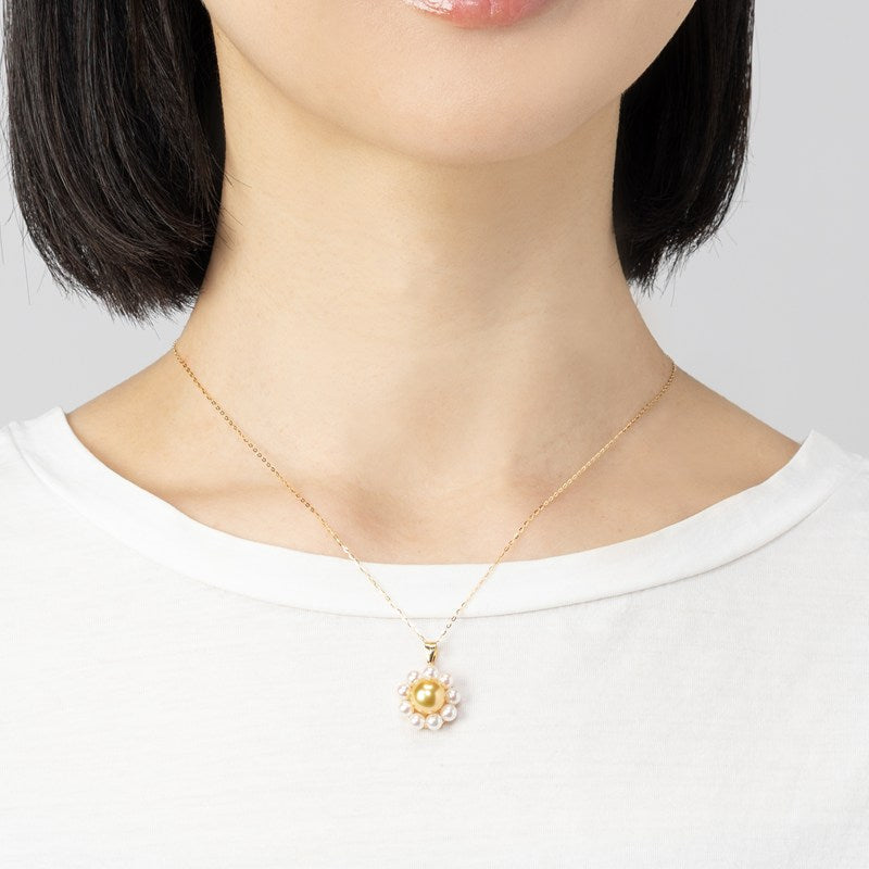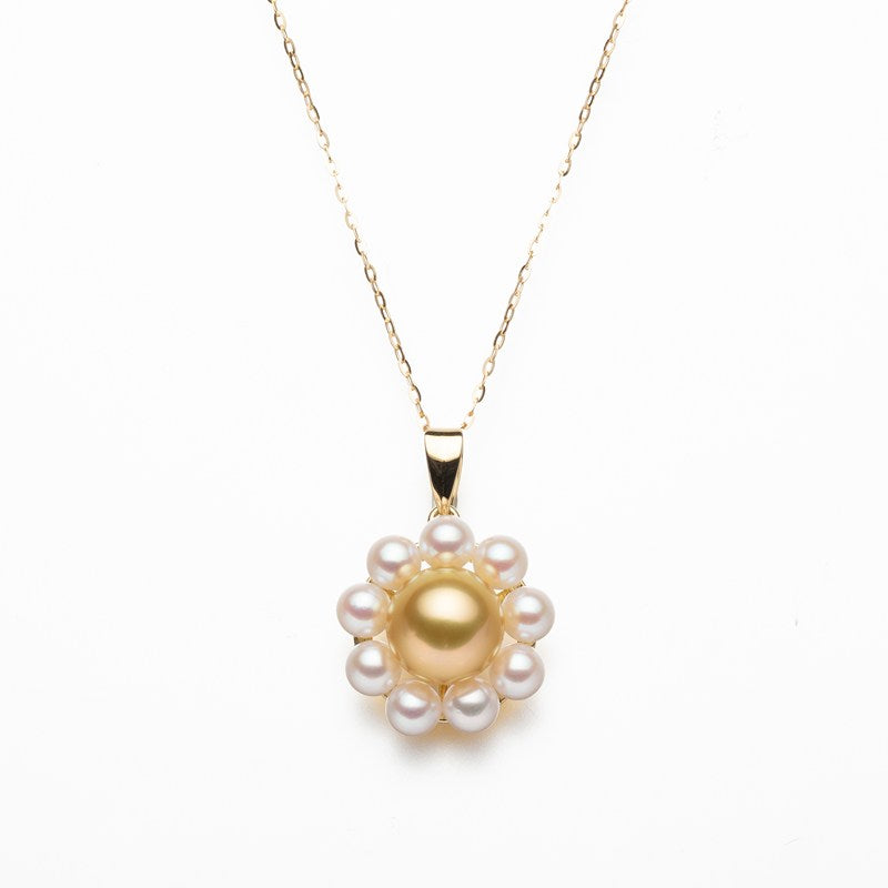 中心の金色の輝きを、4.5mmの可憐なアコヤパールが花びらのように囲み、華やかさと上品さを兼ね備えたデザインに仕上げました。