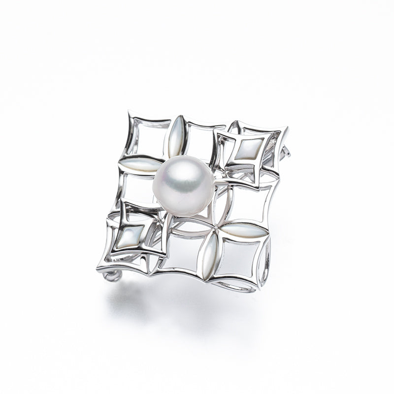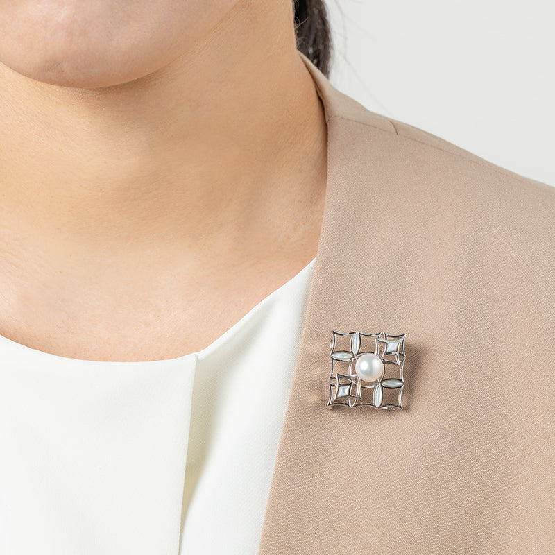 8.5mmのアコヤパールを中心に据えた、洗練されたシルバーブローチ。
