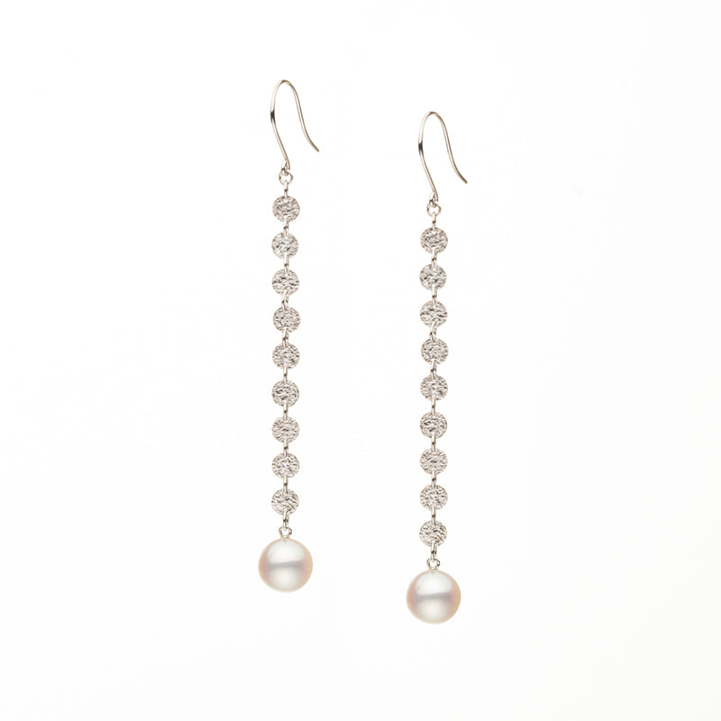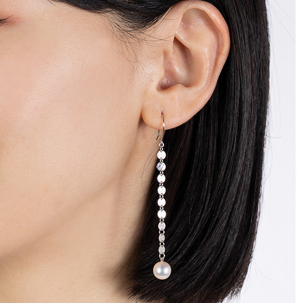 繊細なチェーン状のデザインに、7.5mmのアコヤパールをあしらったK18ホワイトゴールドのロングピアス。