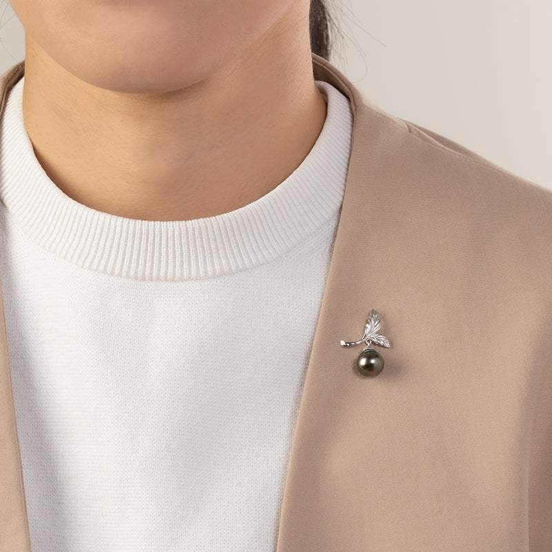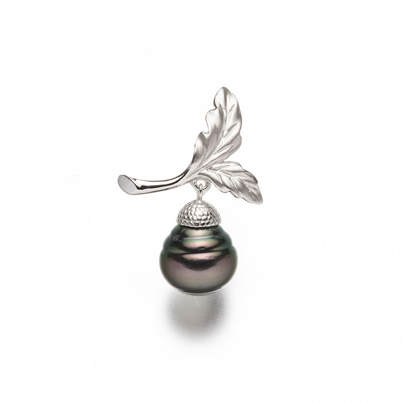 シルバーで丁寧に彫刻された葉とどんぐりのモチーフに、深みのある輝きを放つ黒蝶パールを組み合わせたピンブローチです。