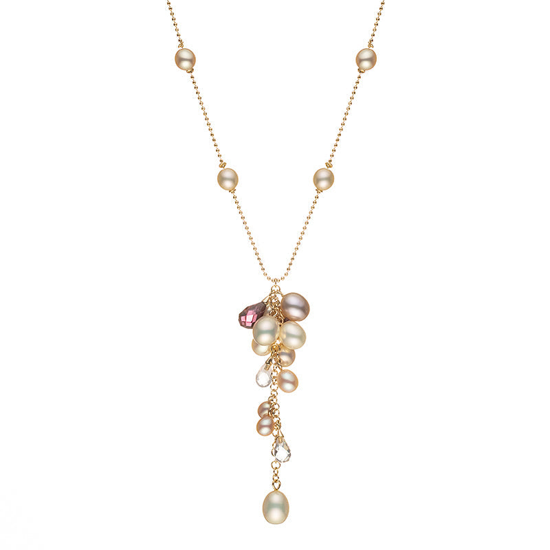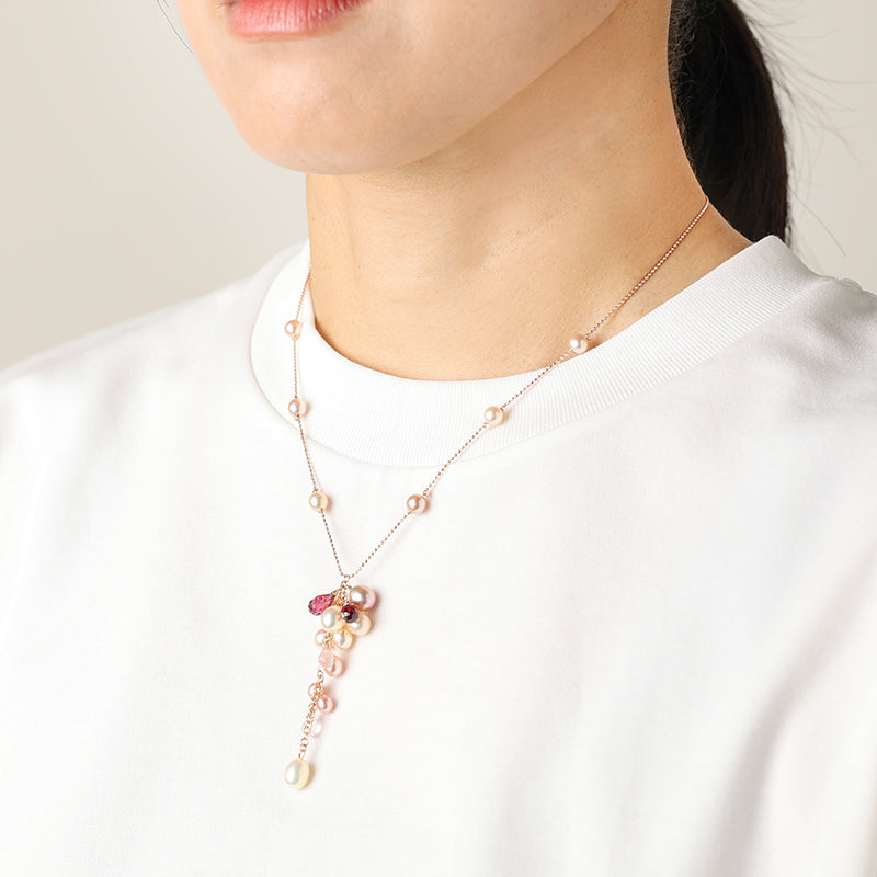 K18ピンクゴールドの繊細なチェーンに、淡水パールをリズミカルにあしらい、胸元には淡水パール・ロードライトガーネット・ローズクォーツを贅沢に重ねた華やかなペンダントです。