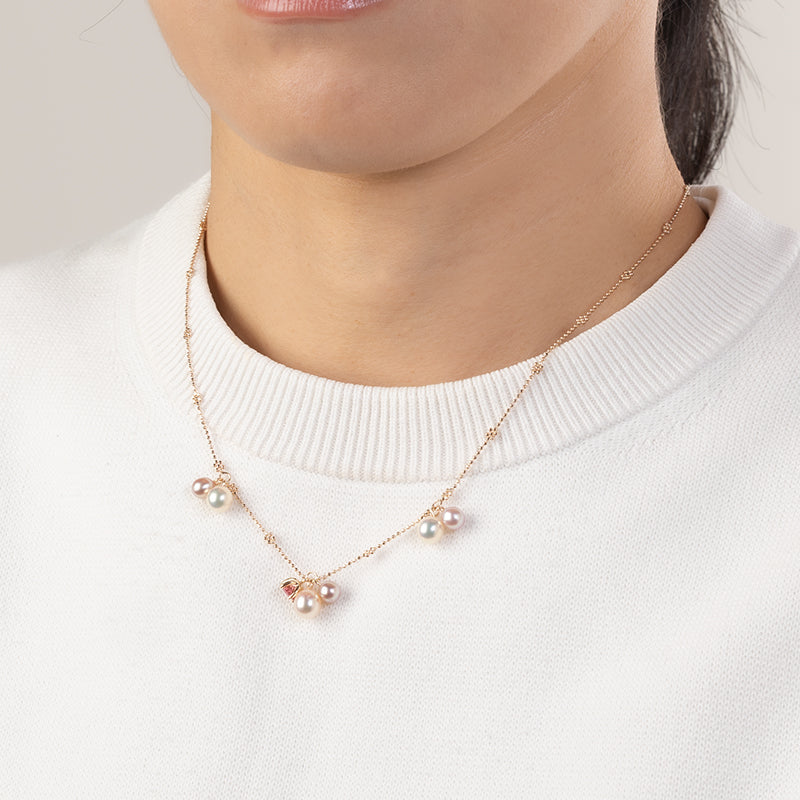 淡水パールが小さく揺れるたびに優しい光を放ち、中央のピンクトルマリンがアクセントとして胸元に透明感のある彩りを添えます。