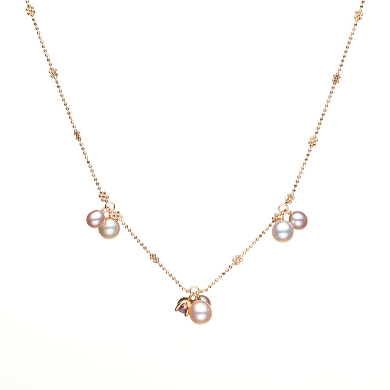 K18ピンクゴールドの繊細なチェーンに、淡水パールとピンクトルマリンをバランスよくあしらった、可憐で華やかなペンダントです。