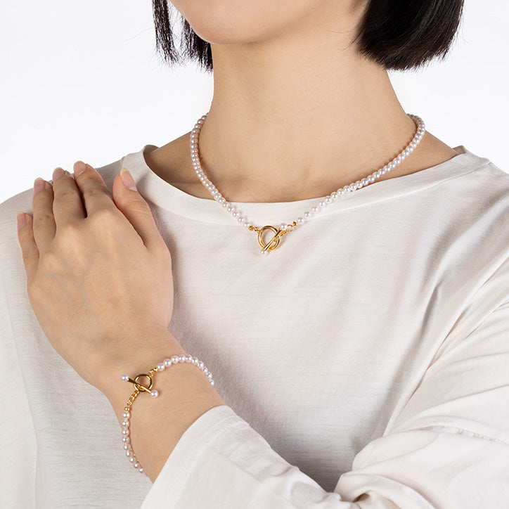 トグル金具とパールのバランスが手元にも上品なアクセントを添え、統一感のあるコーディネートをお楽しみいただけます。