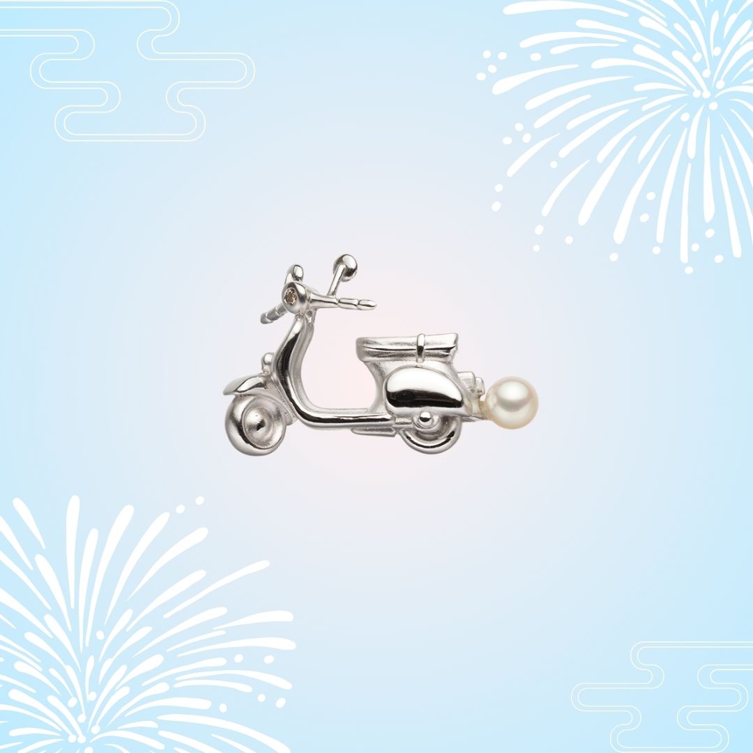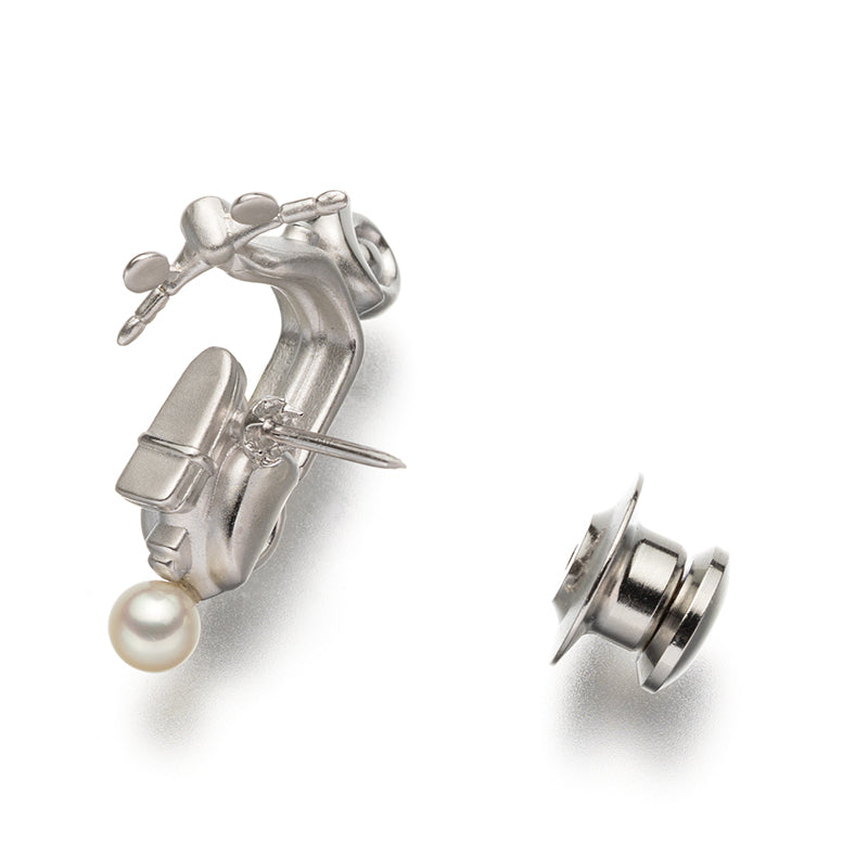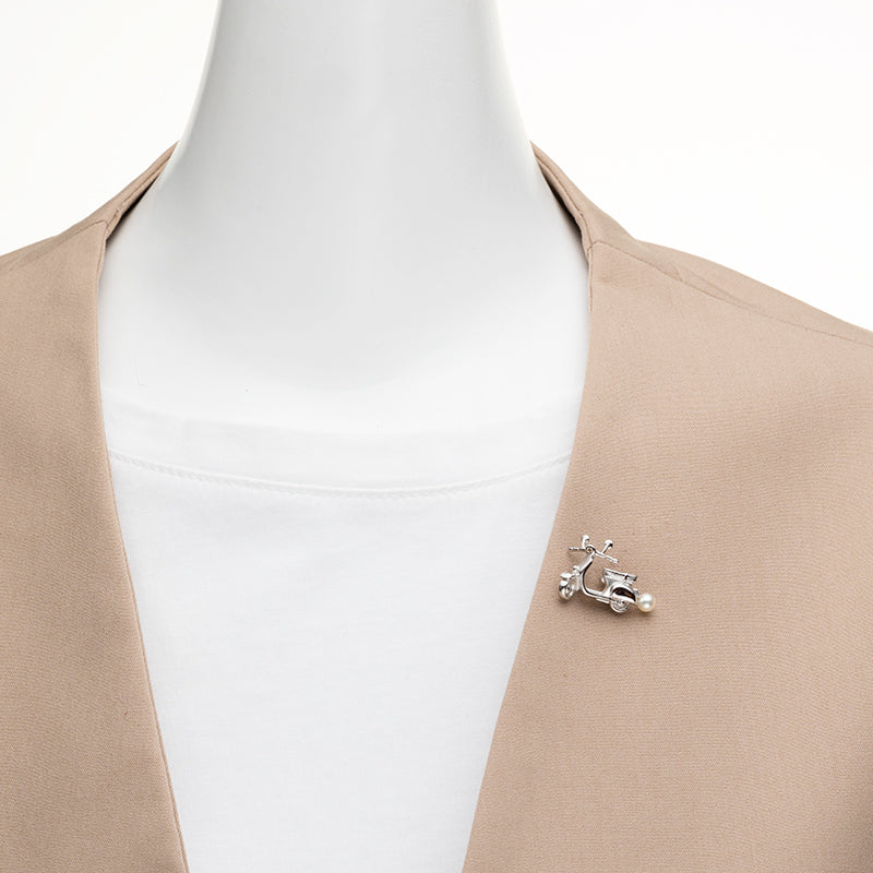 俏皮的自行车图案别针胸针,由银制成,镶嵌有 4 毫米 Akoya 珍珠。该模型是著名汽车 Vespa。车头灯上装饰着闪闪发光的钻石,设计精巧,细致入微。它小巧而又引人注目,只需将它随意地挂在夹克或包上,就能成为时尚的点缀。这是一道散发着成人幽默的菜肴。