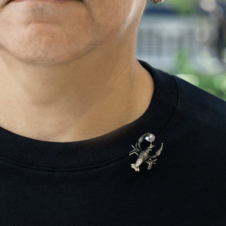 由银制成并经过氧化处理的龙虾图案别针胸针。剪刀尖端有一颗 8.5 毫米的黑珍珠,营造出逼真而有趣的效果。 烟熏色给人一种厚重感和氛围,即使是简单的服装也能增添亮点。它挂在夹克的领子上看起来很棒,而且与 T 恤完美搭配,如图所示。这是一款独特的作品,也推荐给男士。 *该产品与我们的实体店共享库存,因此根据您下订单的时间,可能会出现缺货的情况。 感谢您的理解。